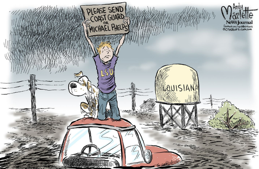 In the U.S., Louisiana is "under water" due to another flood. The U.S. men's Swim Team is in deep doo-doo having lied about a supposed hold-up at the Olympic Games in Rio. And Obamacare is being threatened as big companies like Aetna pull out. And of course, Trump continues to implode!